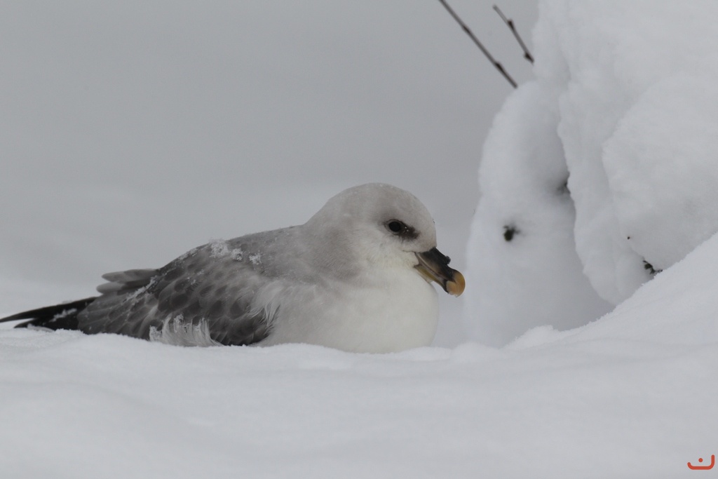 Eksynyt myrskylintu hankien keskellä